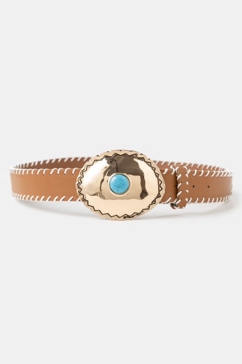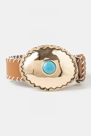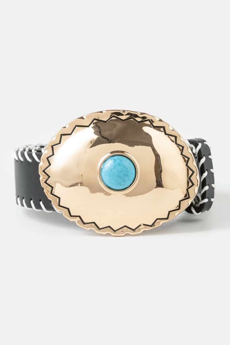 • This belt introduces a stunning western turquoise oval concho buckle style. Unveil modern elegance with this subtly intricate belt.