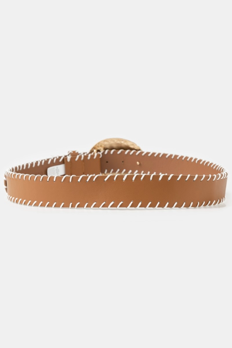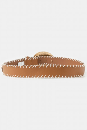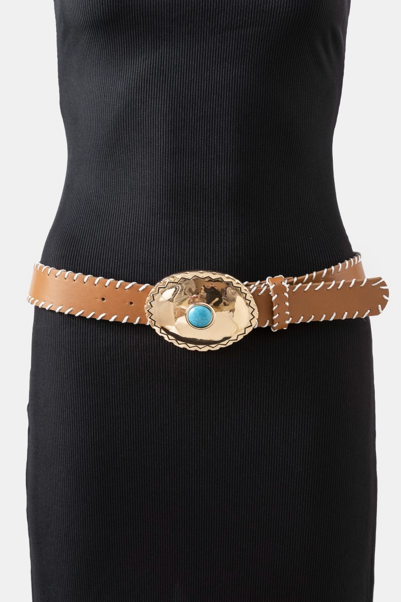 Hammered Oval Buckle Embroidered Vegan Leather Belt