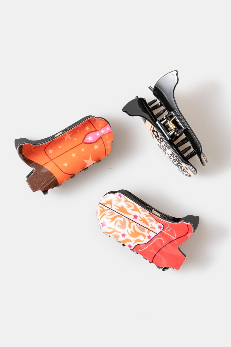 - This hair claw brings a unique three piece cowboy boots set style. Delight in the intricate details that make this hair claw an essential element in expressing your fashion identity.