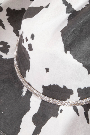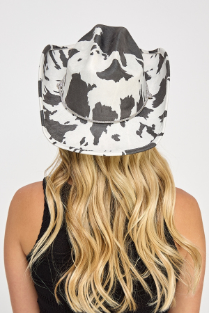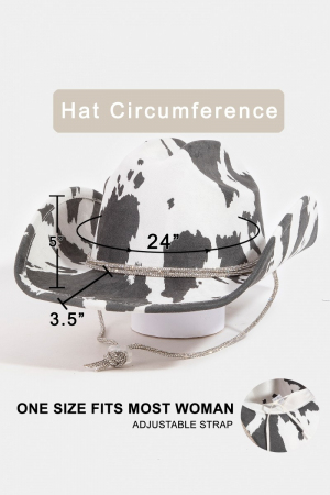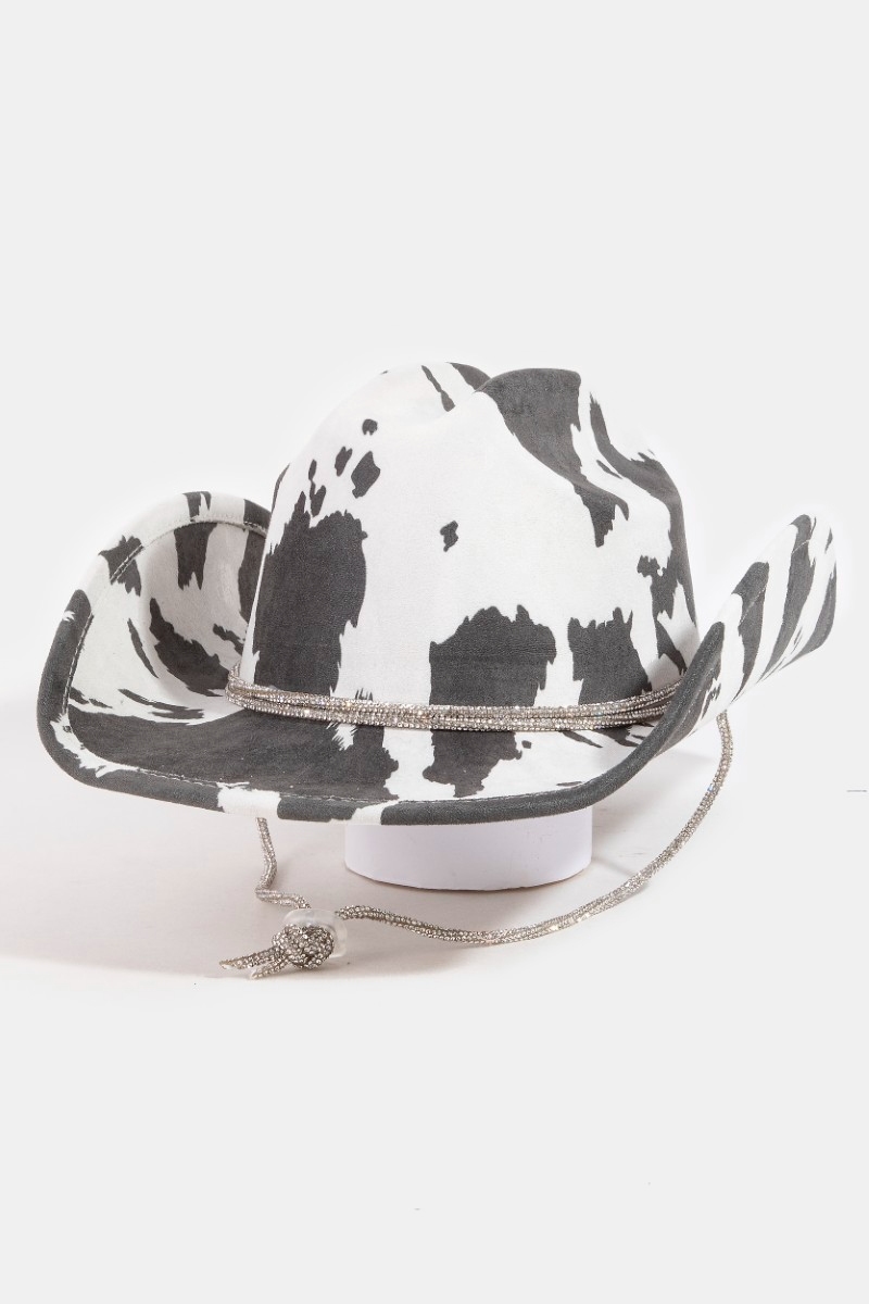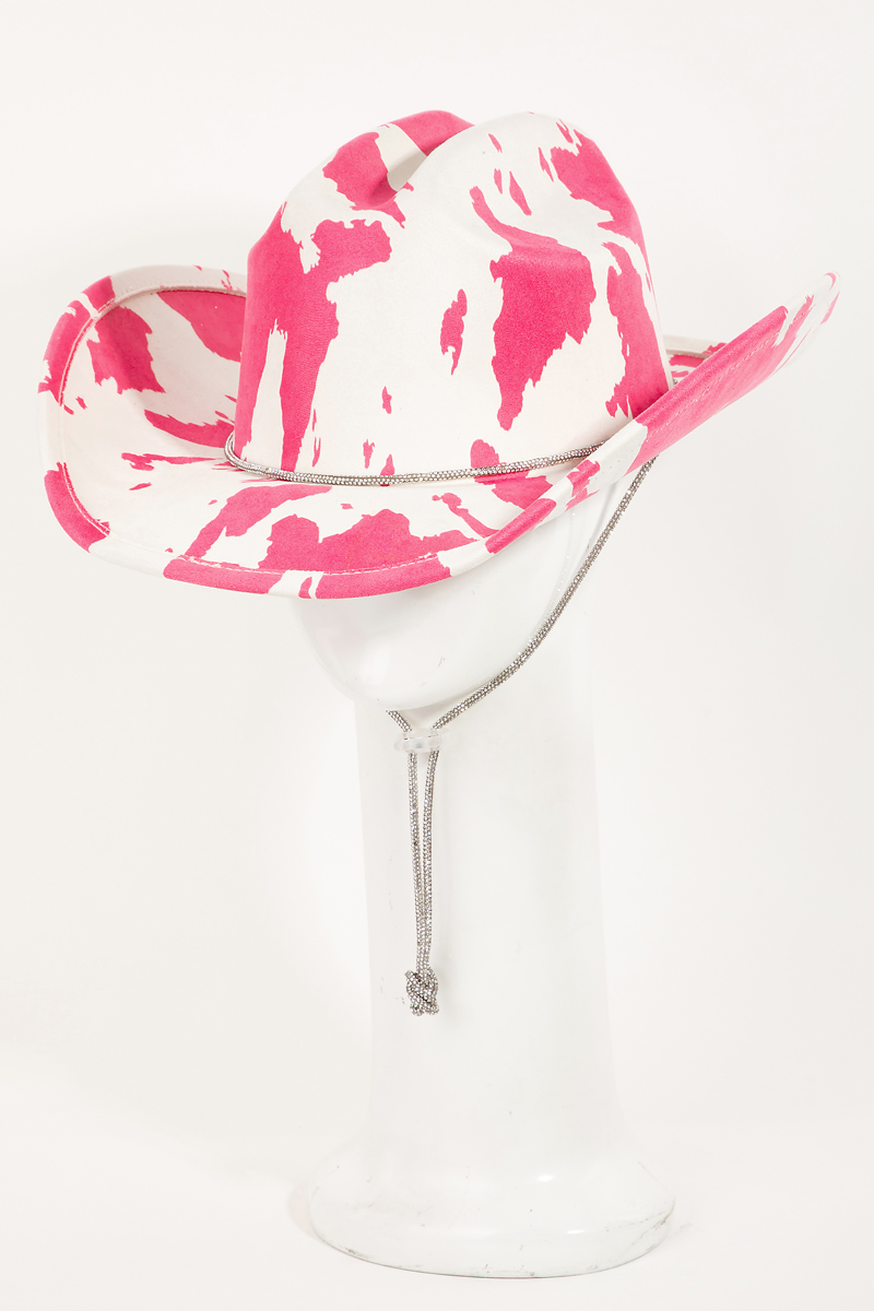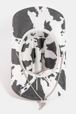 - This cowboy hat brings a stunning cow print draw string style. Discover the perfect balance of subtlety and flair as this cowboy hat effortlessly completes your look.