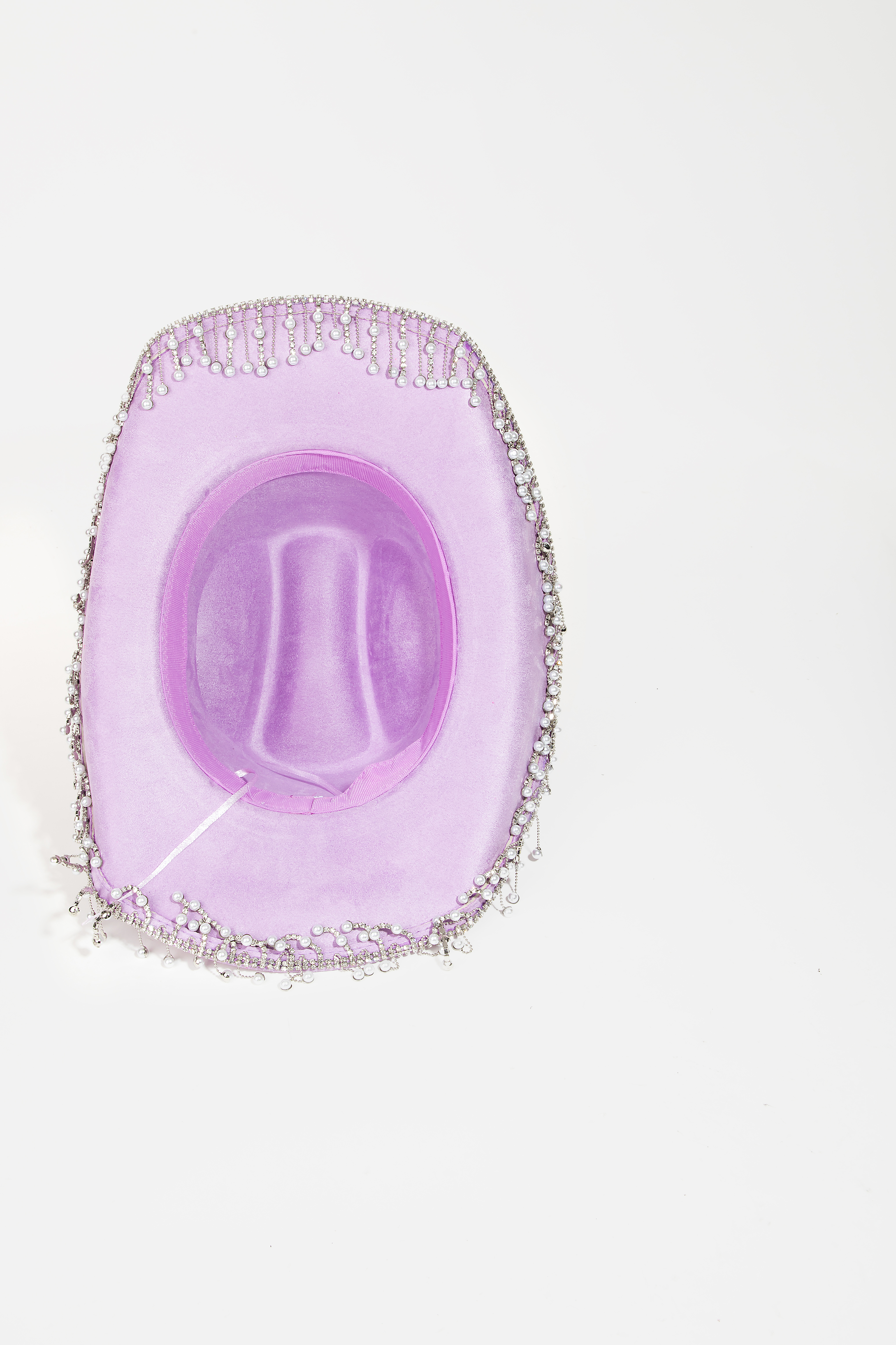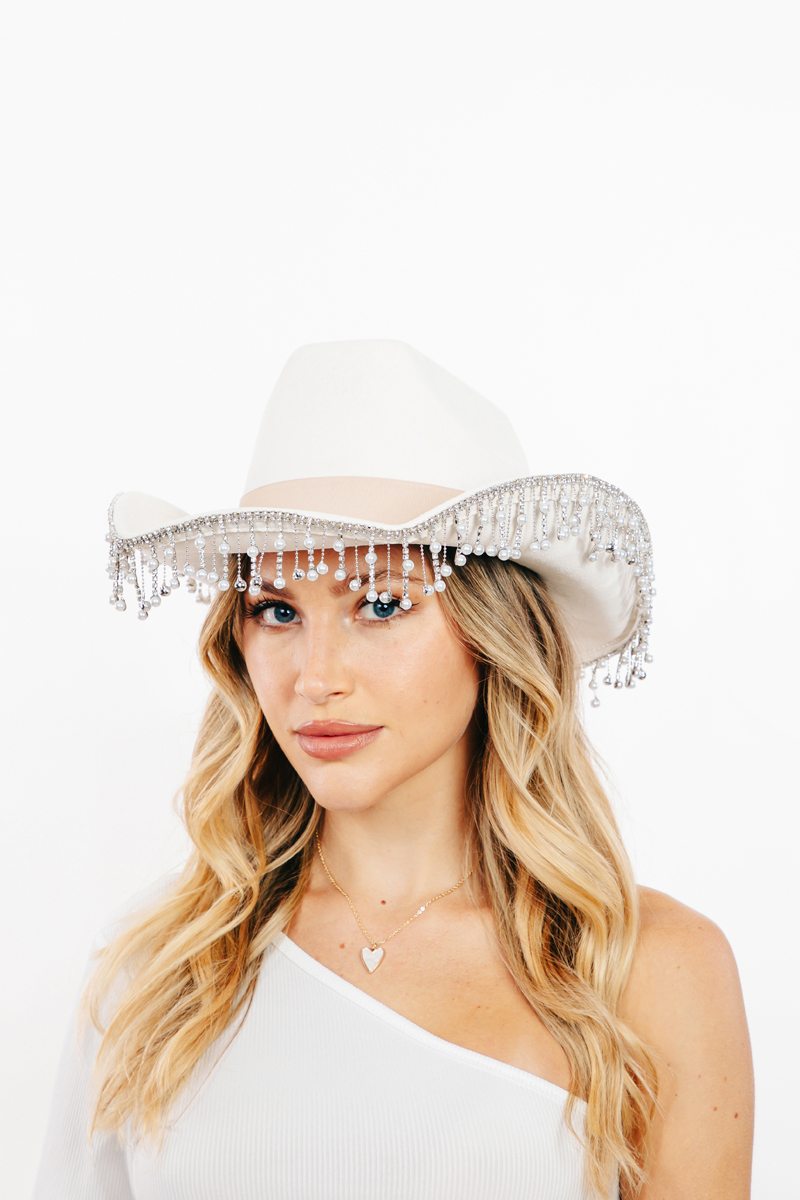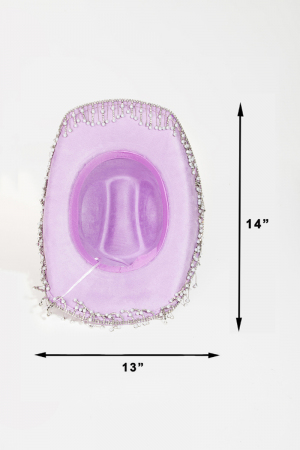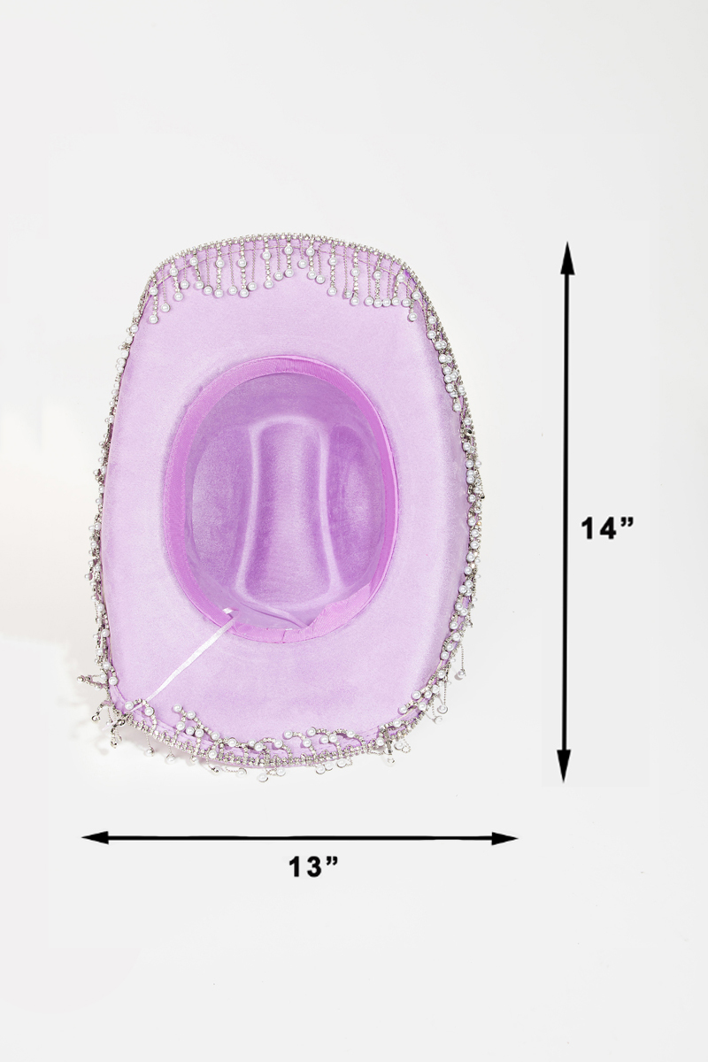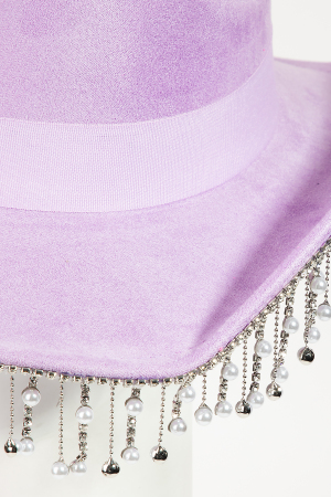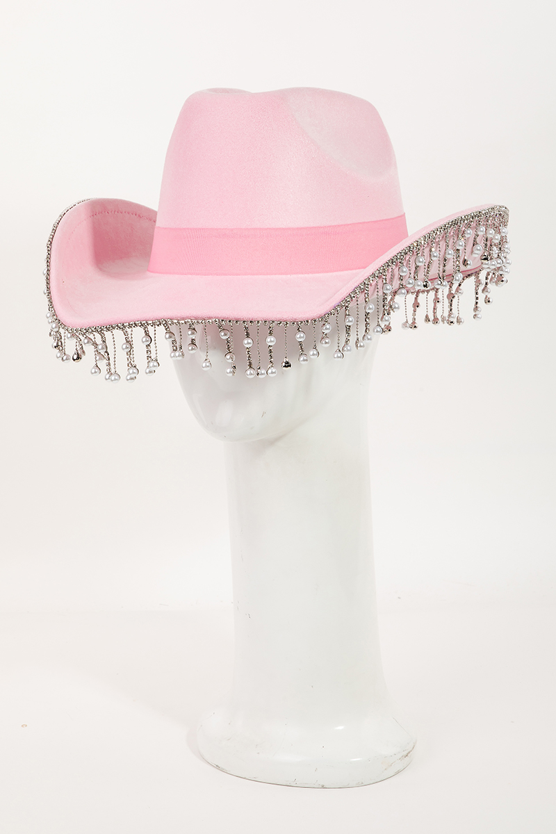 • This cowboy hat features a fashionable pearl rhinestone fringe trim style. Experience a subtle blend of modernity and classic charm as this cowboy hat effortlessly adorns your ensemble.