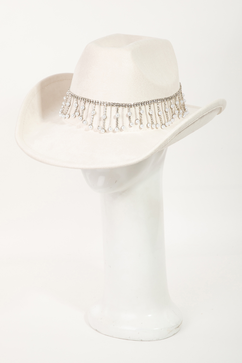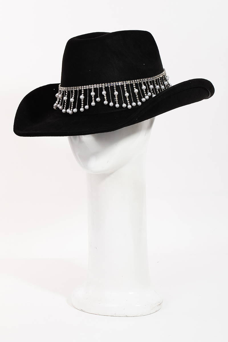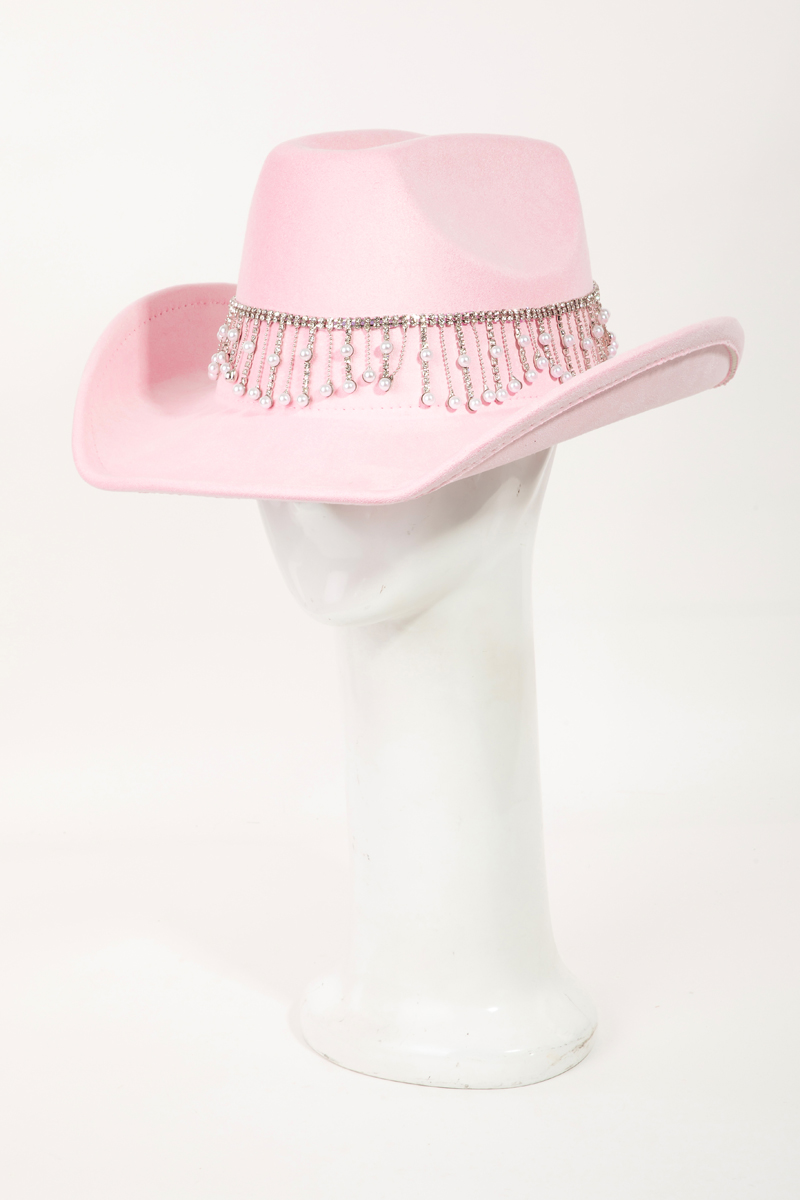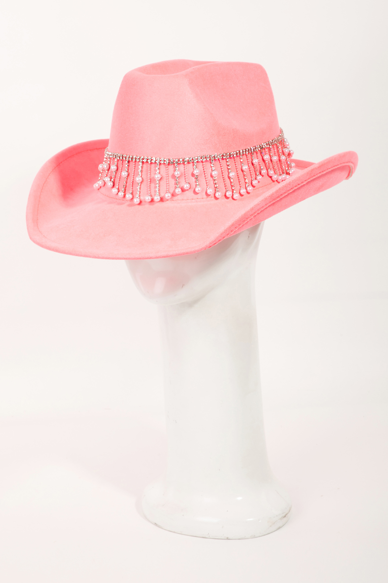 - This cowboy hat displays a vibrant rhinestone and pearly fringe band style. Witness the perfect fusion of style and functionality as this cowboy hat effortlessly complements your lifestyle.