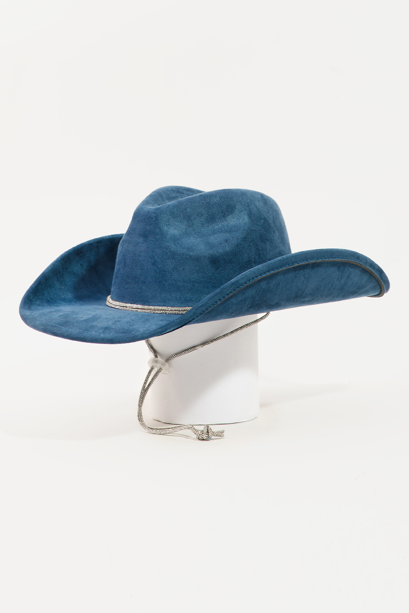 - This cowboy hat introduces a stunning rhinestone rope strap style. Unveil a new dimension of sophistication as this cowboy hat effortlessly enhances the elegance of your ensemble.