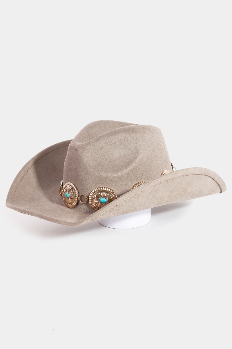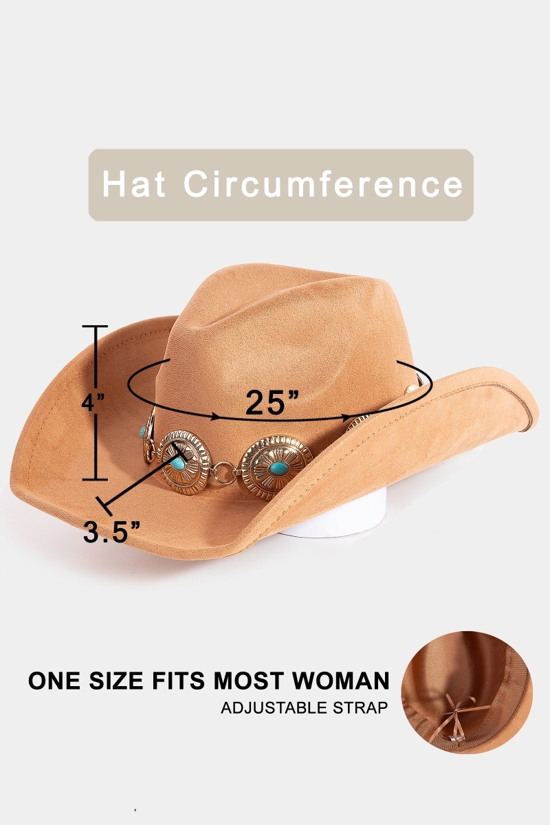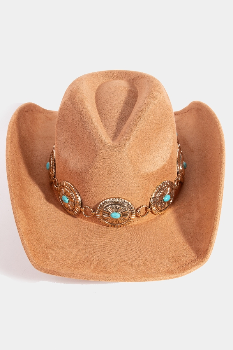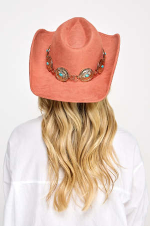 • This cowboy hat introduces a unique turquoise stud oval concho chain style. Revel in the intricate design that effortlessly distinguishes this cowboy hat, making it a statement piece.
