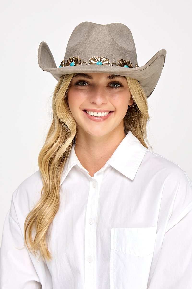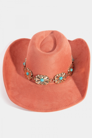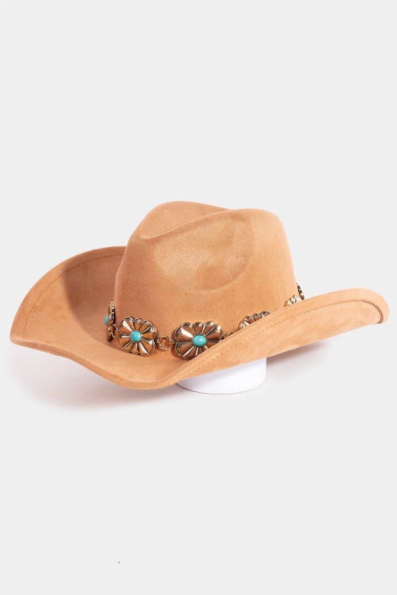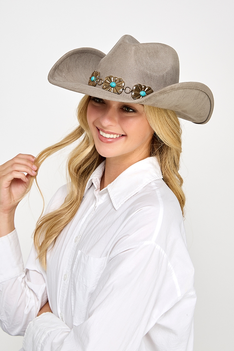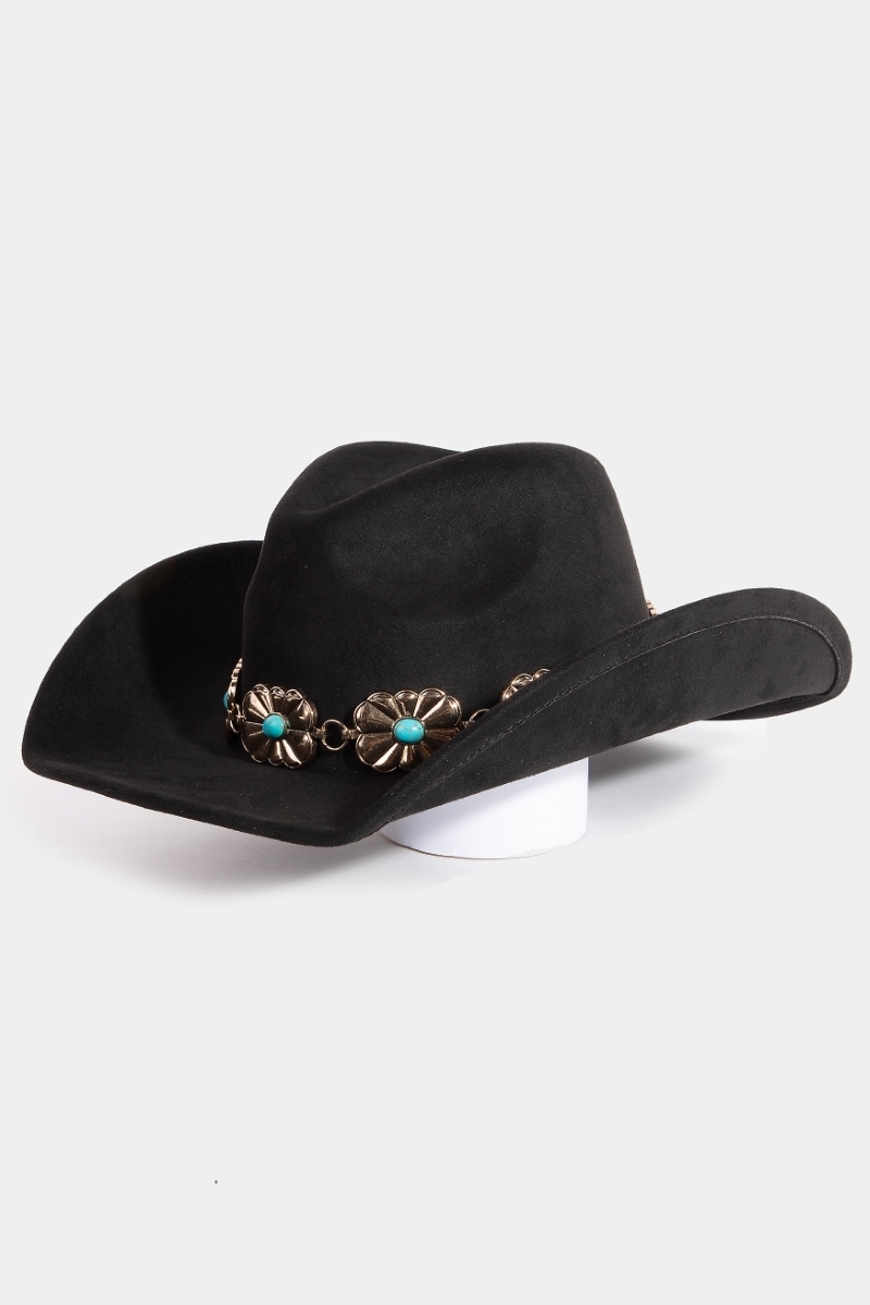 • This cowboy hat brings a stunning turquoise stud rectangular concho chain style. Elevate your ensemble with this cowboy hat that effortlessly captures the essence of refined fashion.