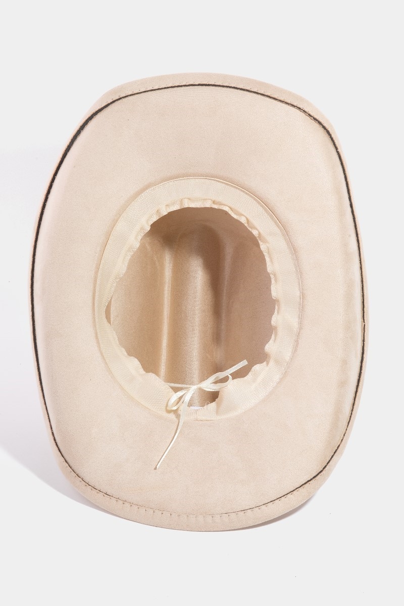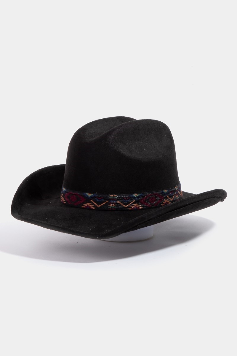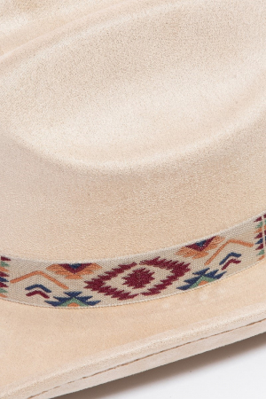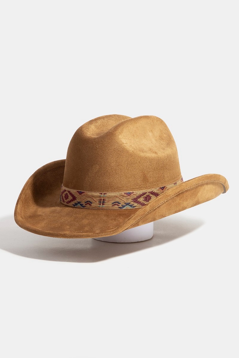 - This cowboy hat brings a luxurious boho embroidered strap faux suede style. Savor the craftsmanship that goes beyond the ordinary, as this cowboy hat effortlessly captivates attention.