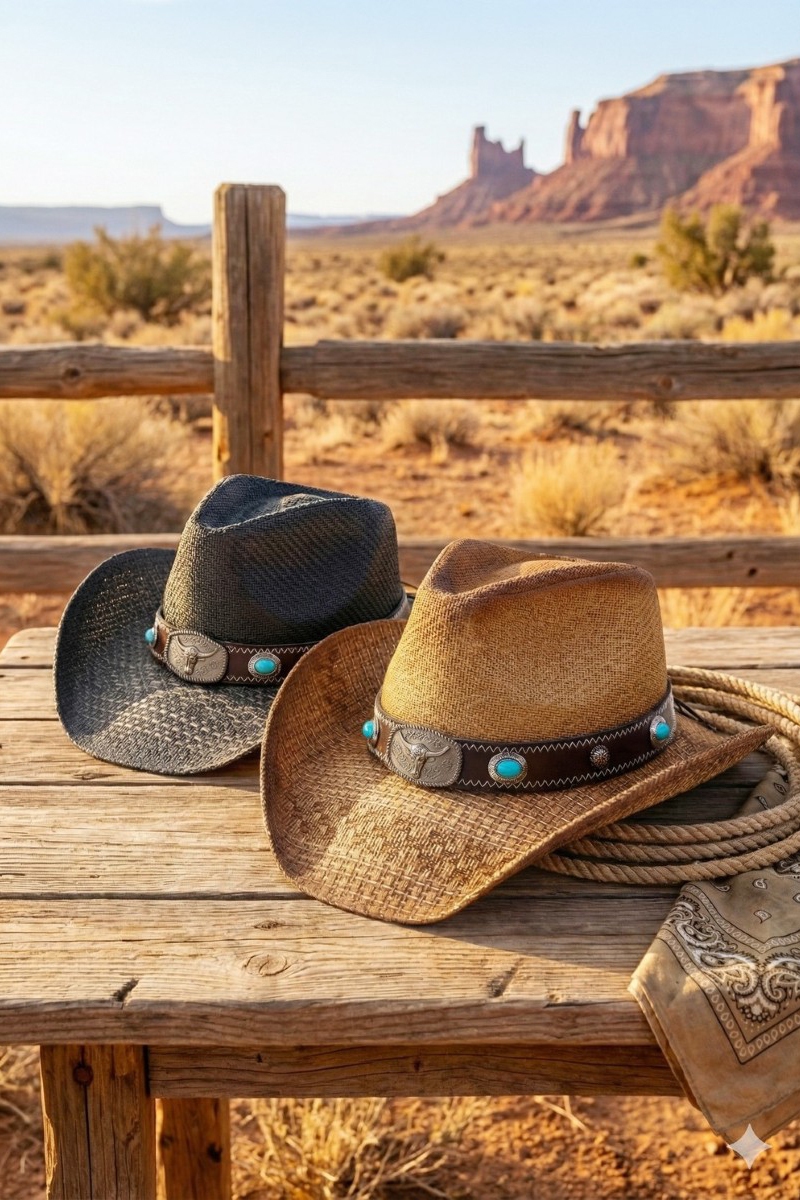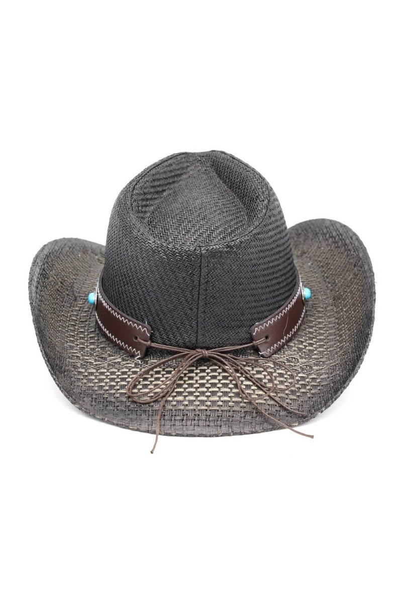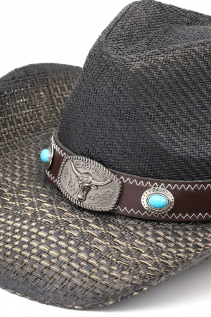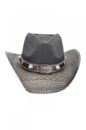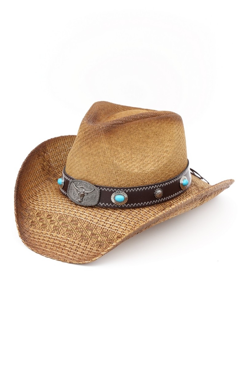 - This cowboy hat displays a vibrant western long horn concho strap straw style. Celebrate the art of accessorizing with this piece that effortlessly encapsulates modern trends.