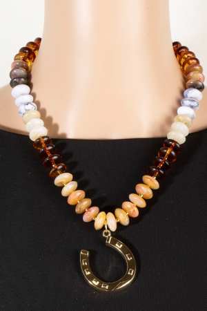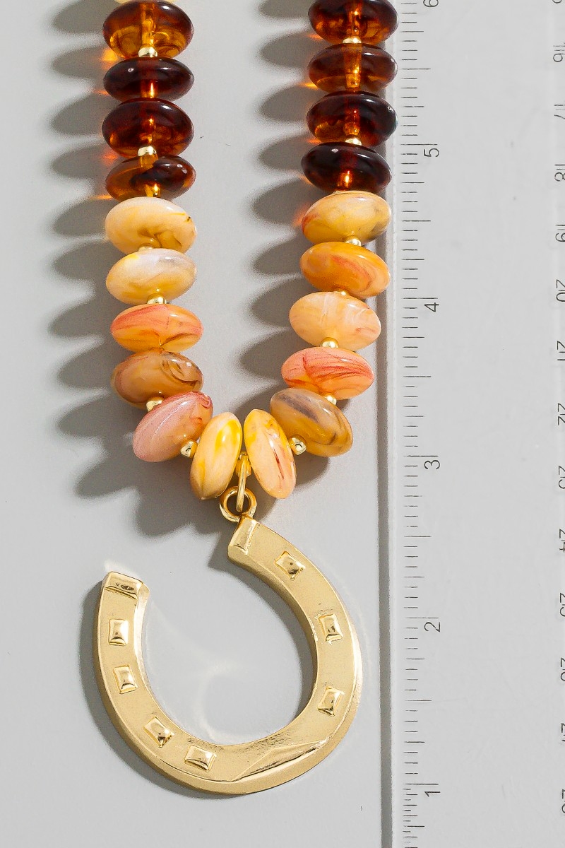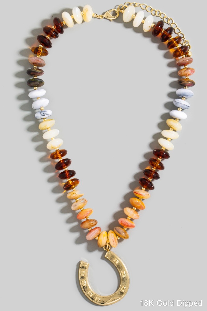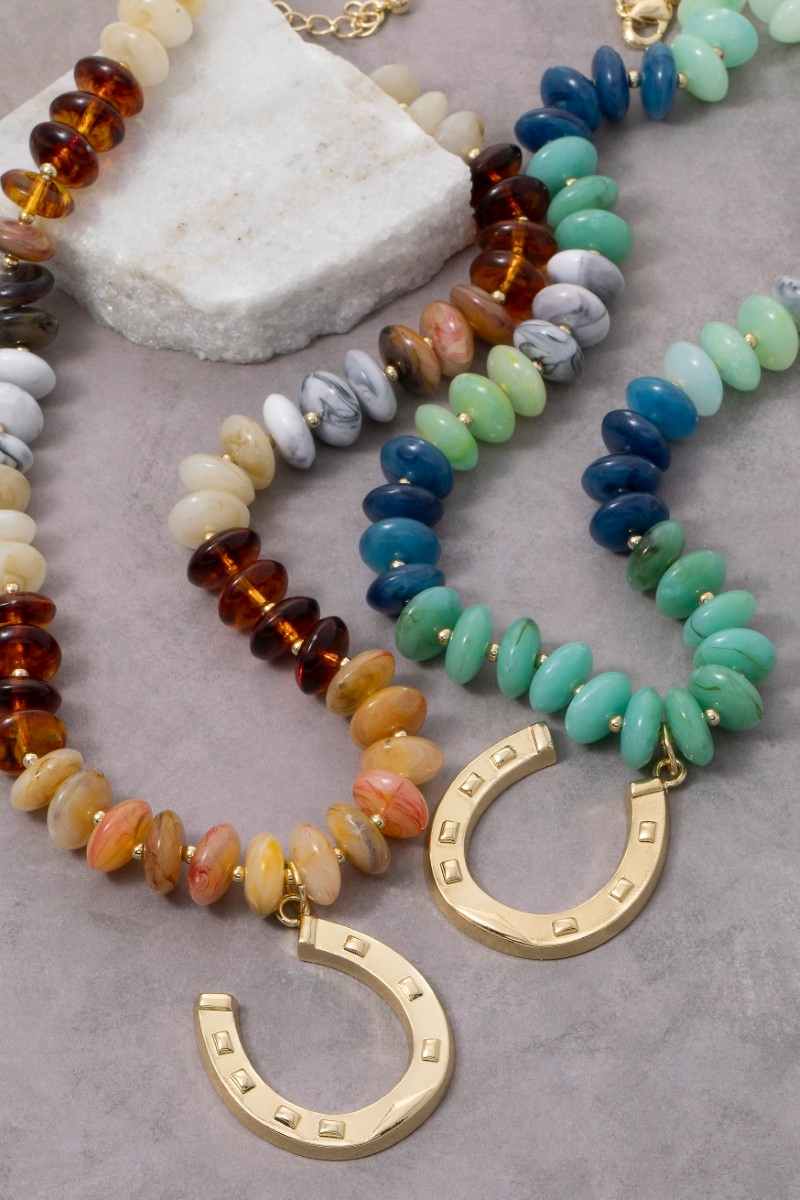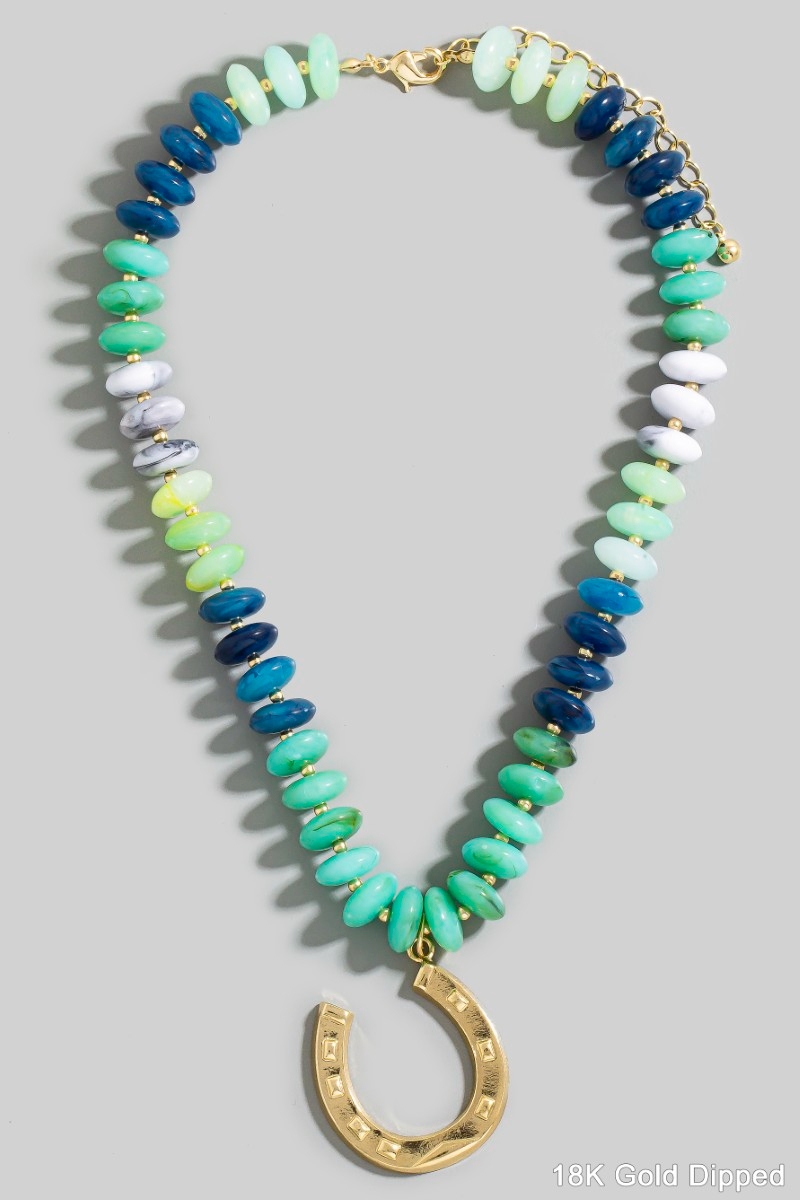 • This necklace introduces a stunning gold dipped horse show pendant marble resin disc beaded style. Celebrate individuality with this necklace that effortlessly expresses your unique sense of style.