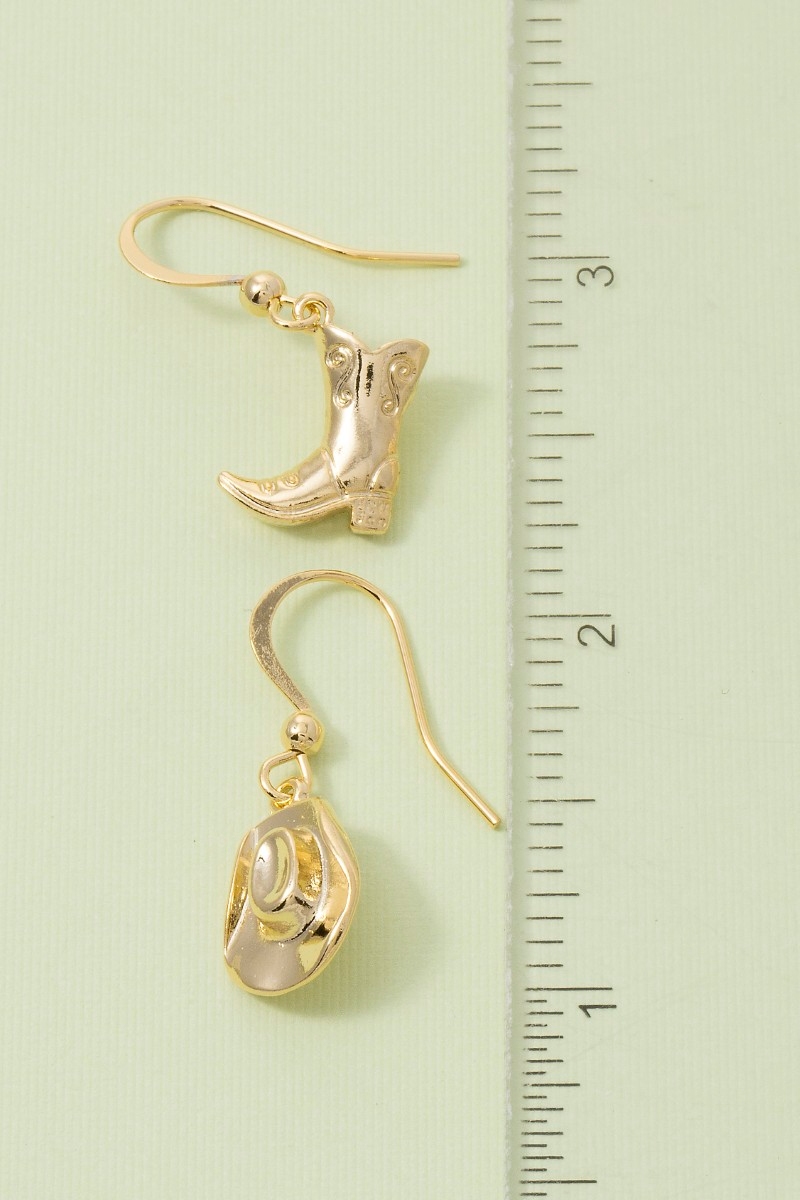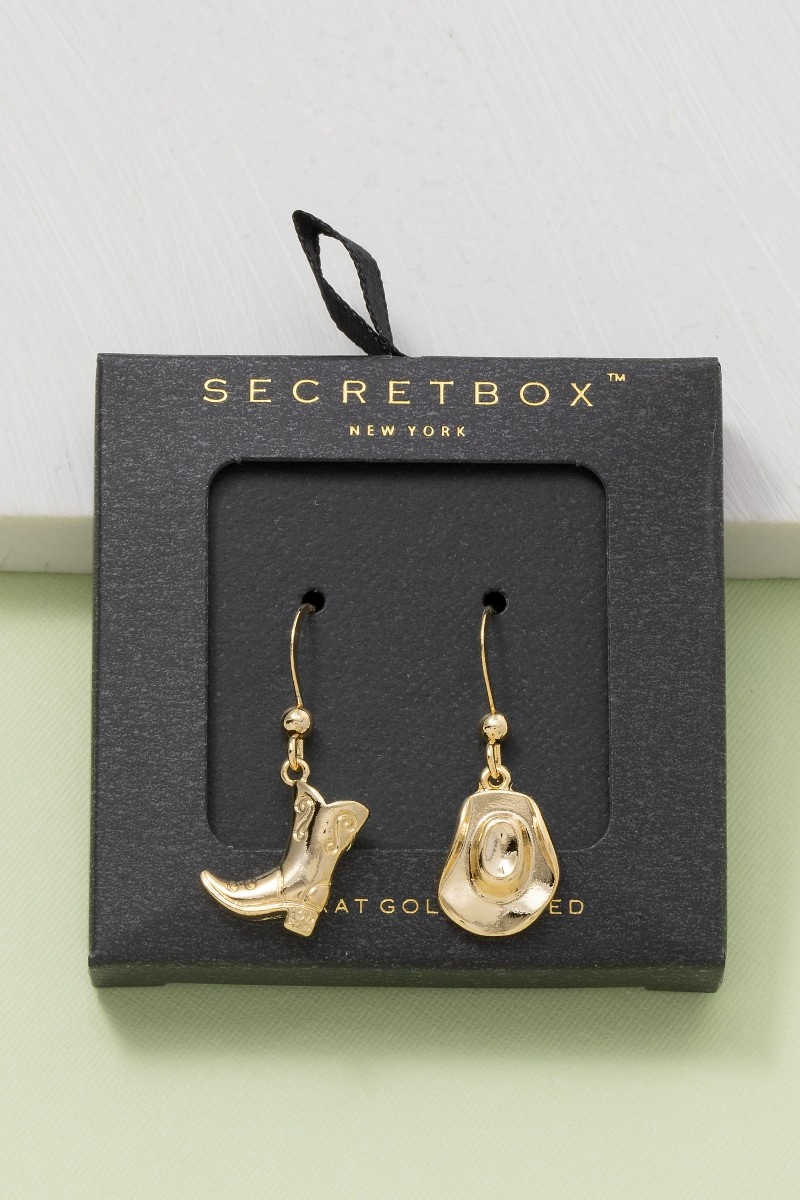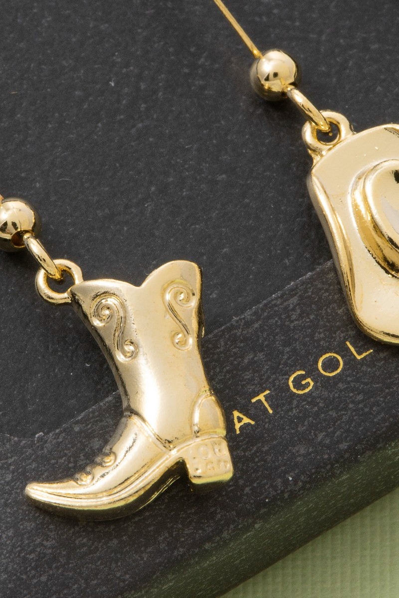 • This pair of drop earrings showcases a timeless secret box gold dipped cowboy boots and hat style. Explore a blend of classic charm and contemporary flair.