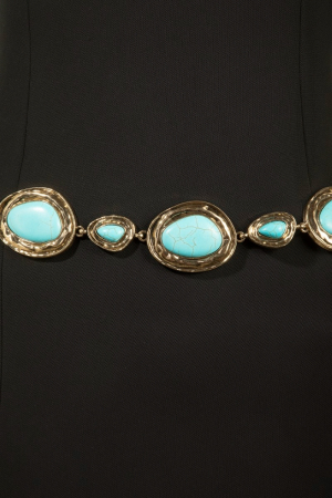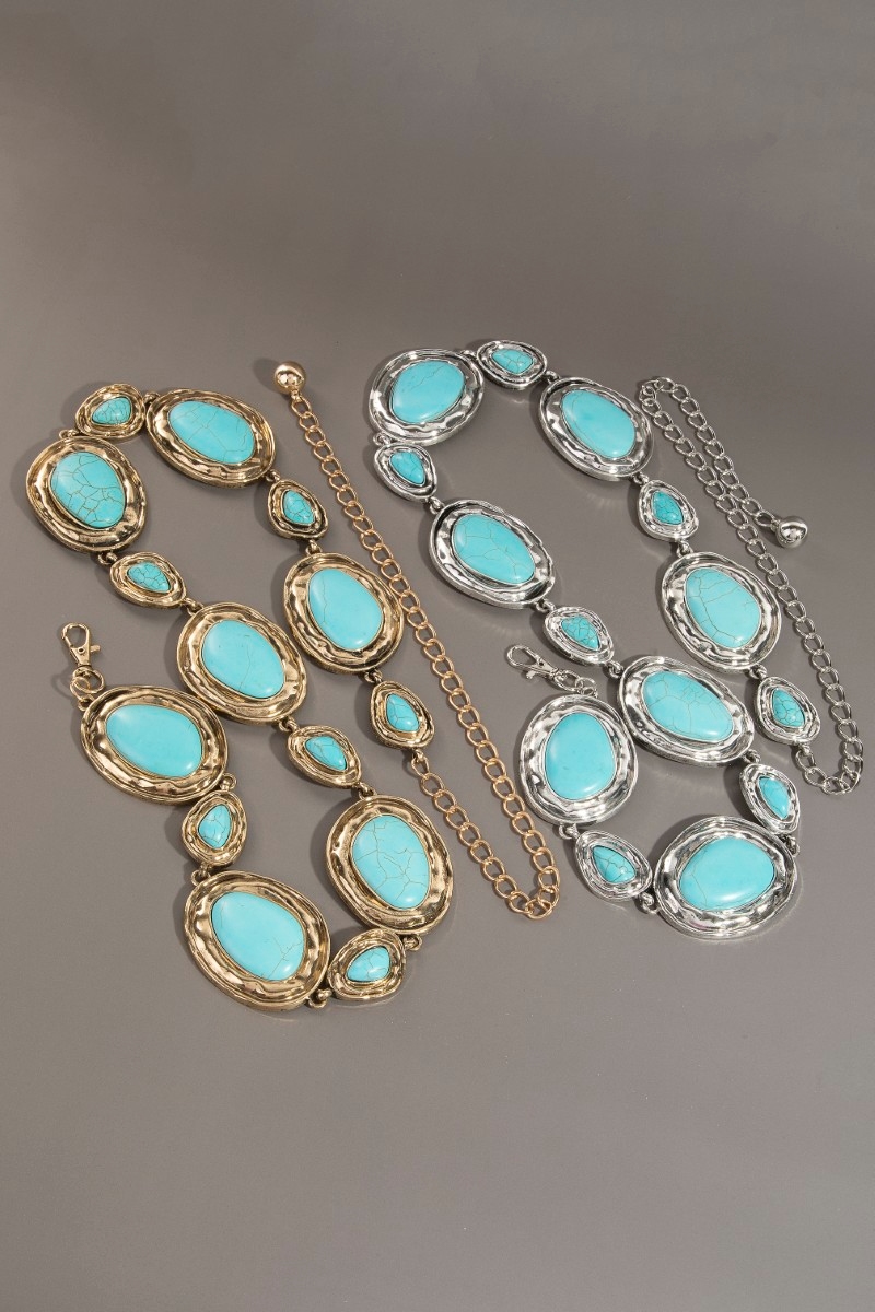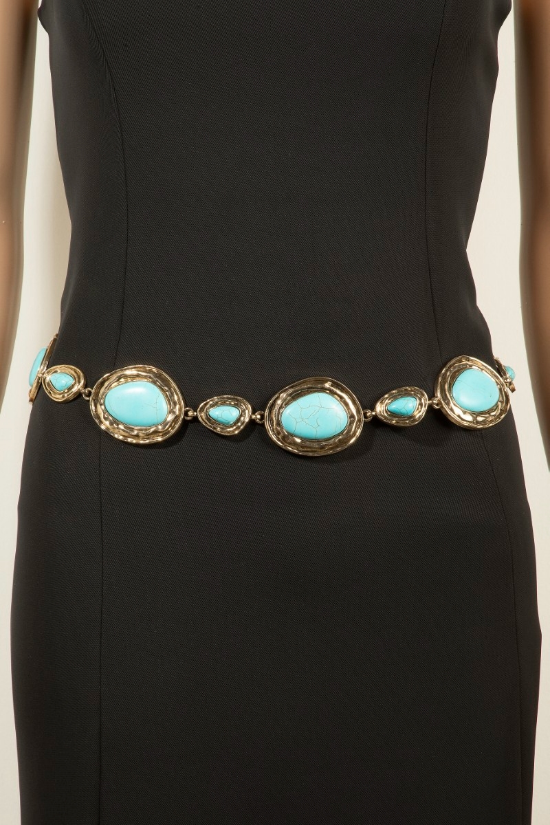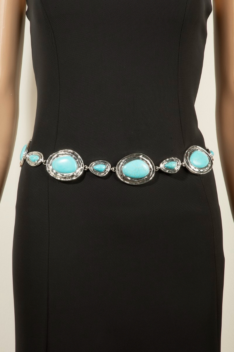 - This chain belt brings a unique ornate western concho turquoise stone style. Celebrate the art of accessorizing with this piece that effortlessly encapsulates modern trends.