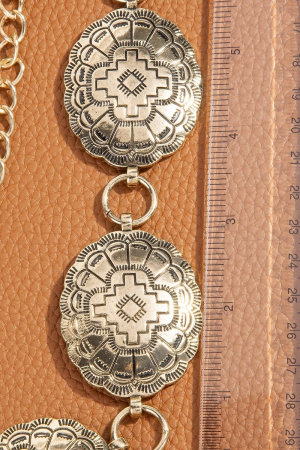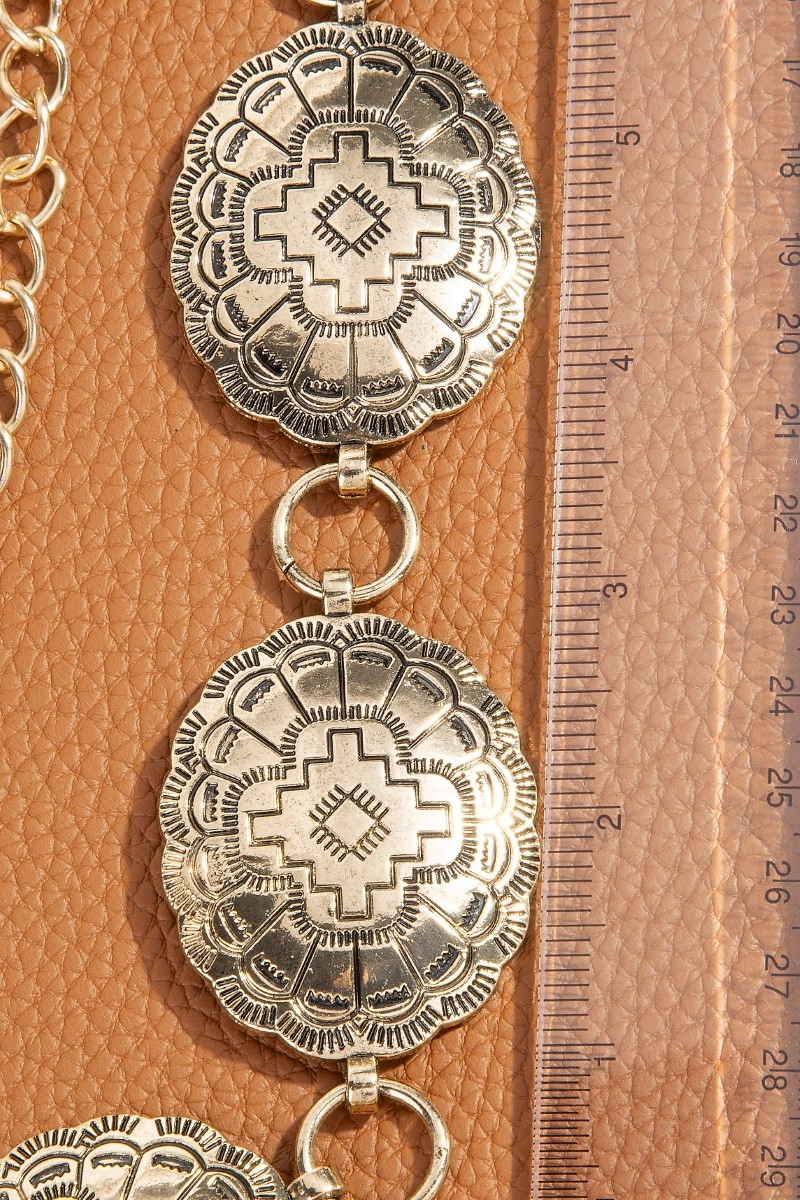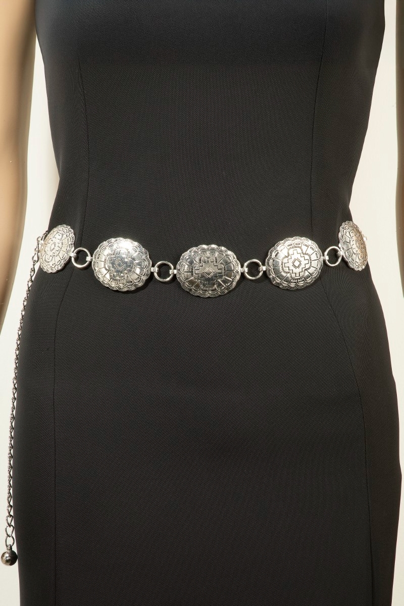 • This chain belt displays a vibrant oval western concho disc style. Celebrate individuality with this chain belt that effortlessly expresses your unique sense of style.