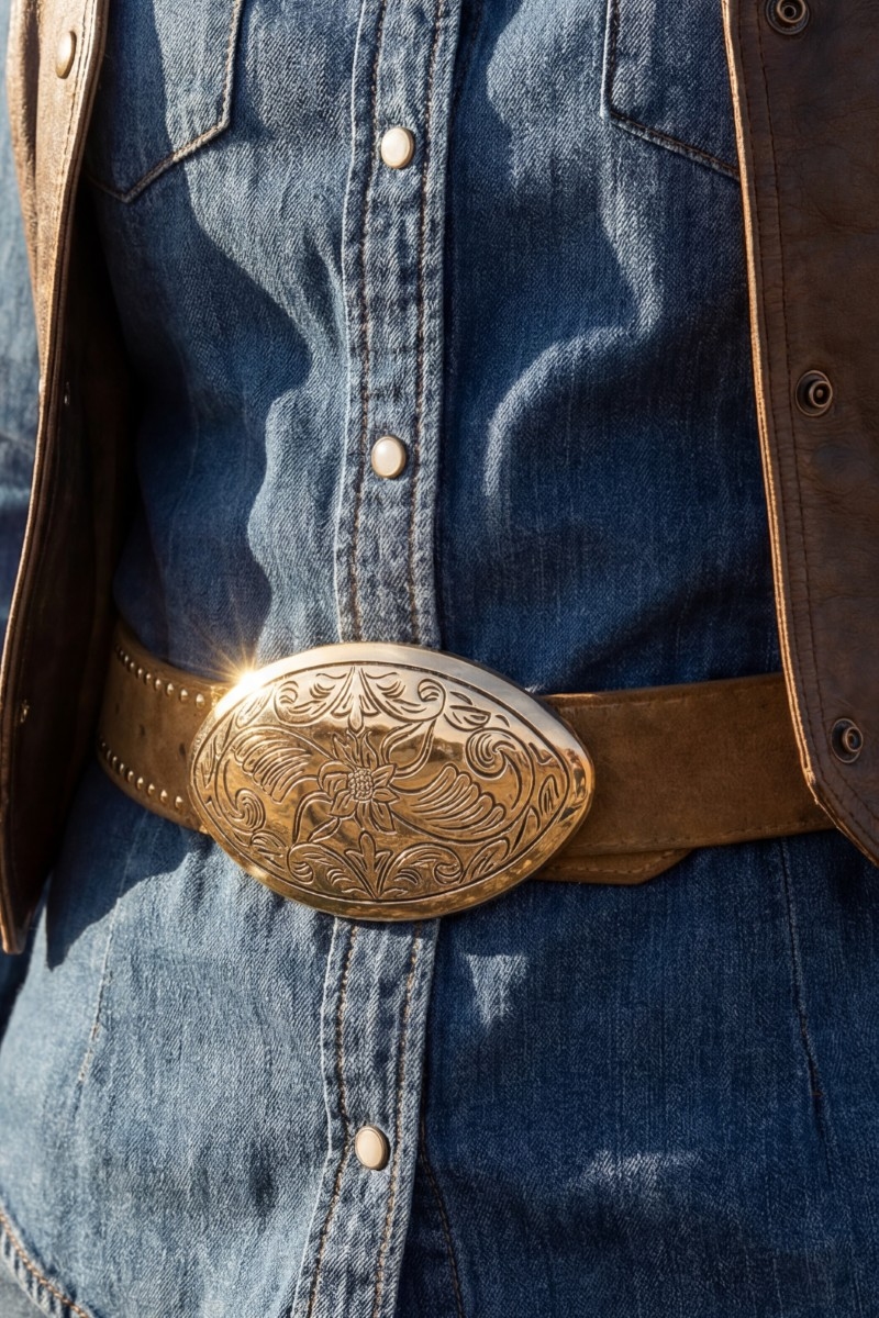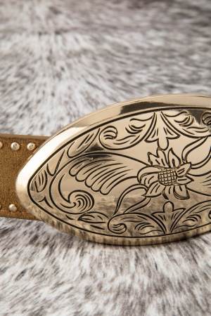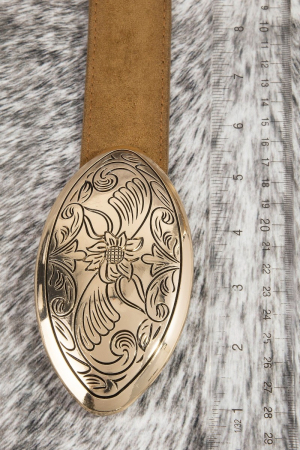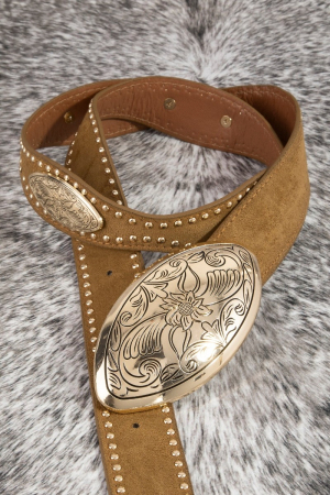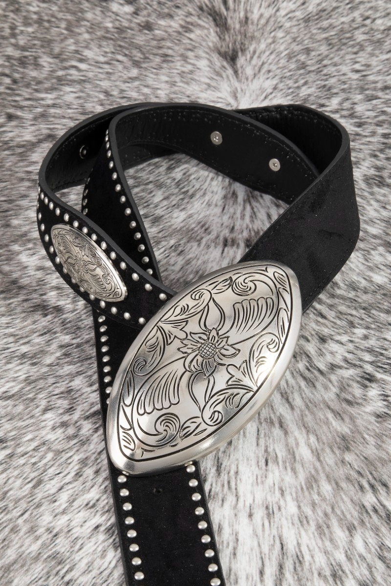 • This belt showcases a timeless vegan leather western oval concho style. Experience refined sophistication with this understated yet stylish piece.
