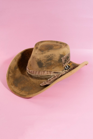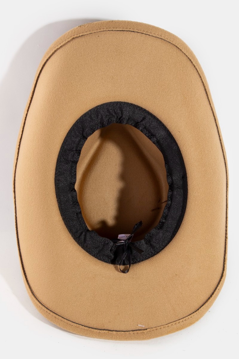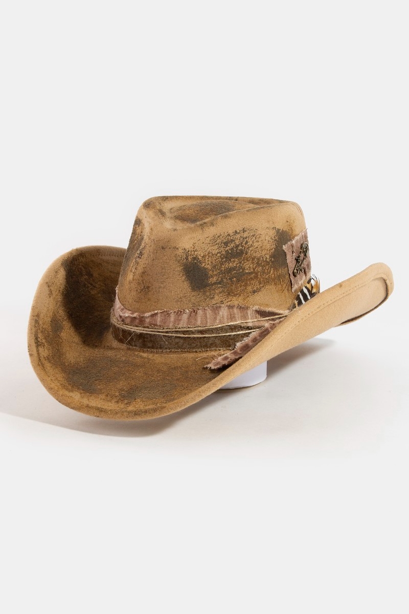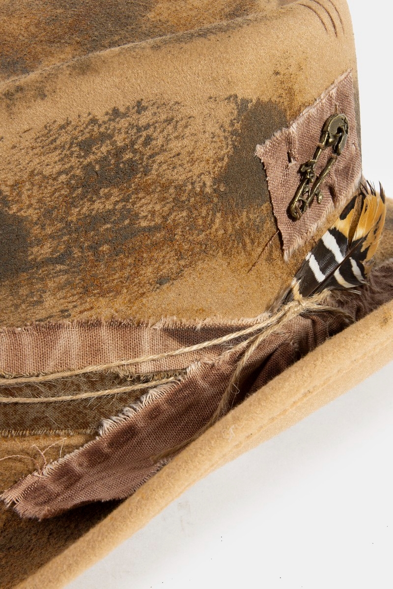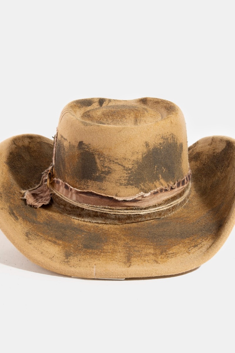 • This cowboy hat brings a stunning vintage strap and safety pin patched western style. Explore a refined sense of style with this cowboy hat, seamlessly elevating the chic factor of your look.