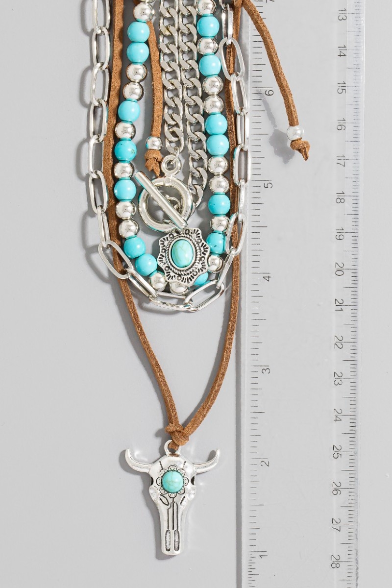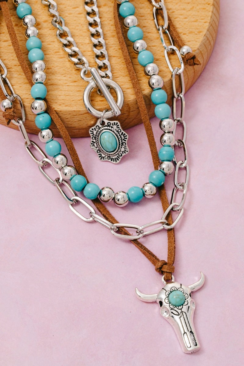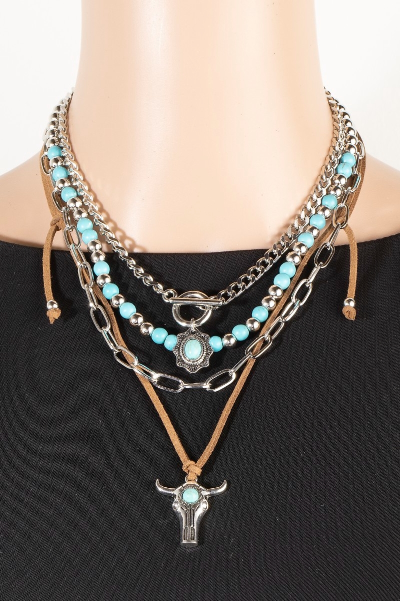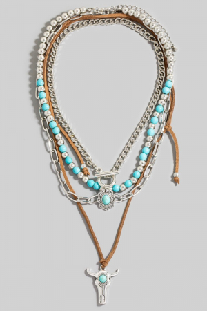 • This layered necklace features a fashionable western charms chains cord and turquoise beads style. Redefine your look effortlessly with this standout, on-trend piece.