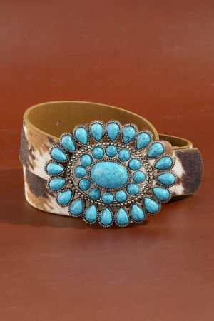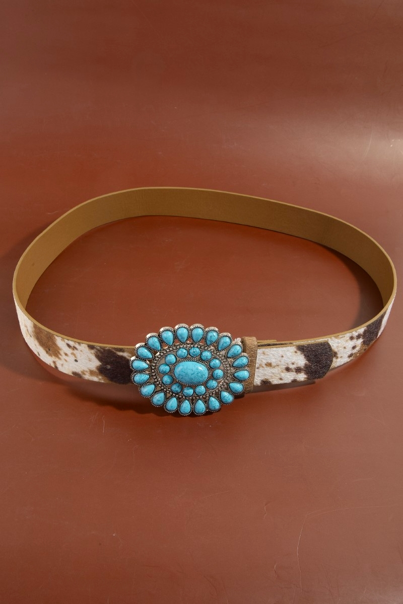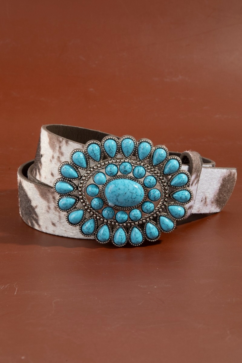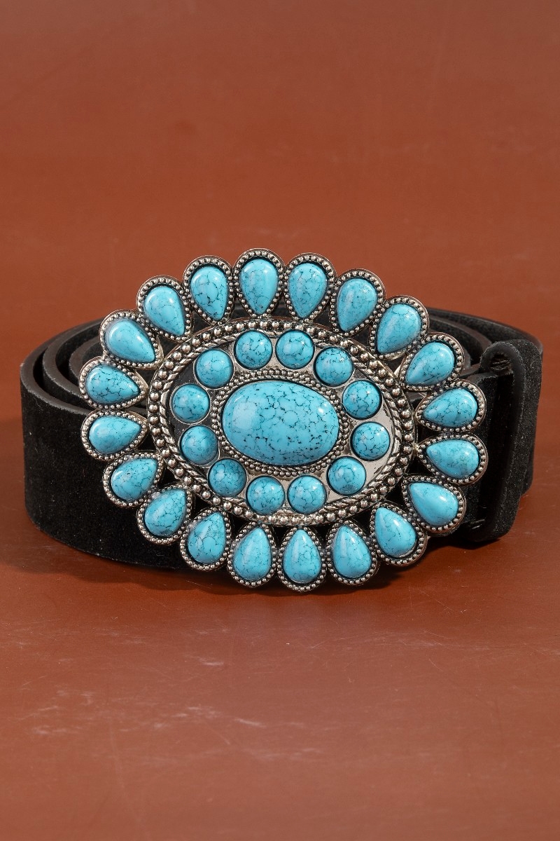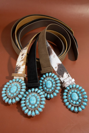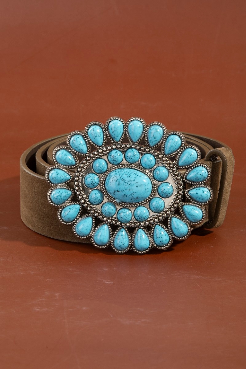 - This belt introduces a unique western concho turquoise stone buckle style. Immerse yourself in fashion finesse with this statement belt.