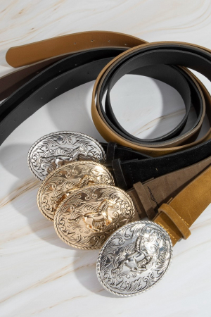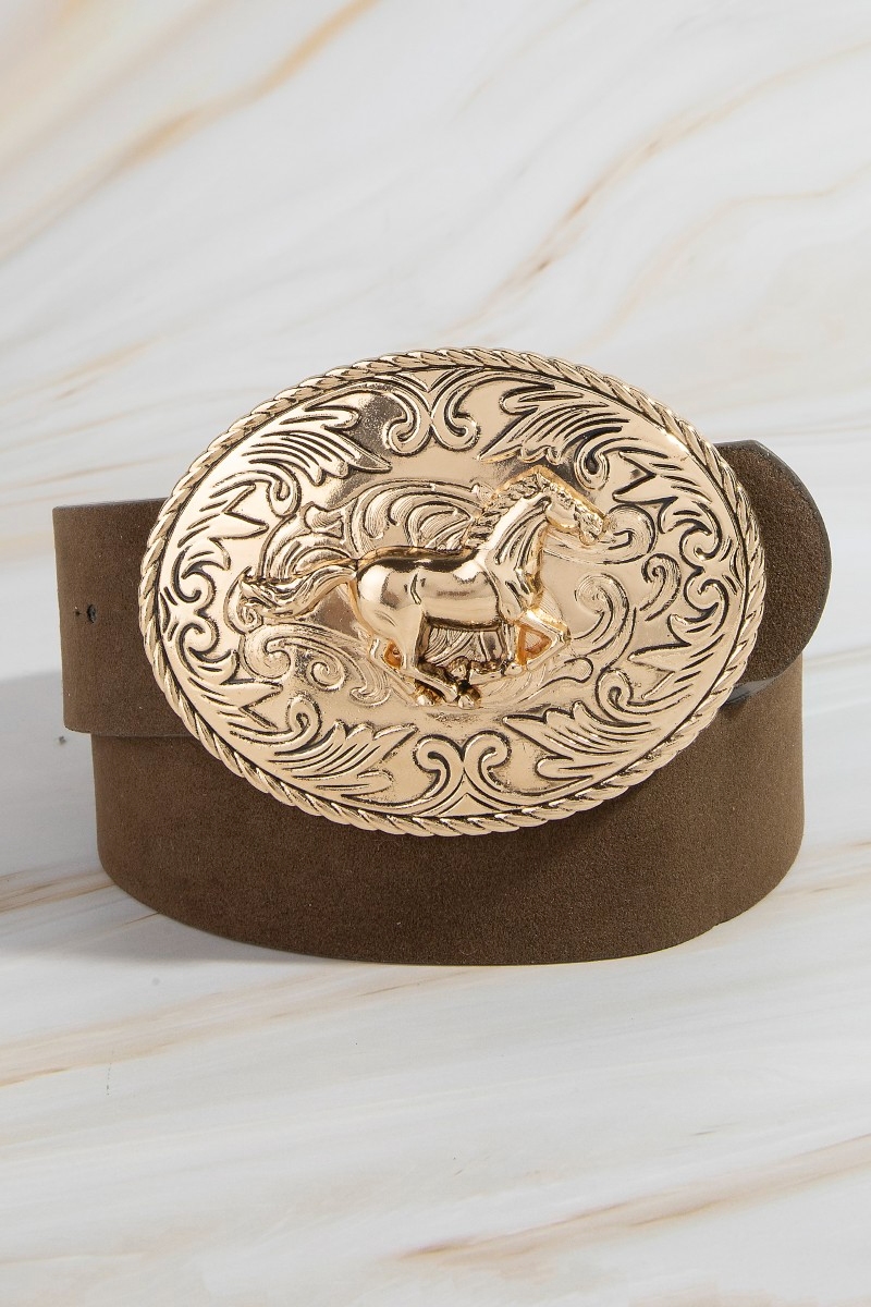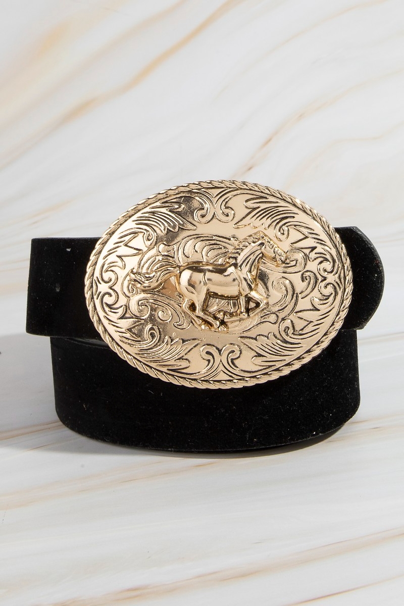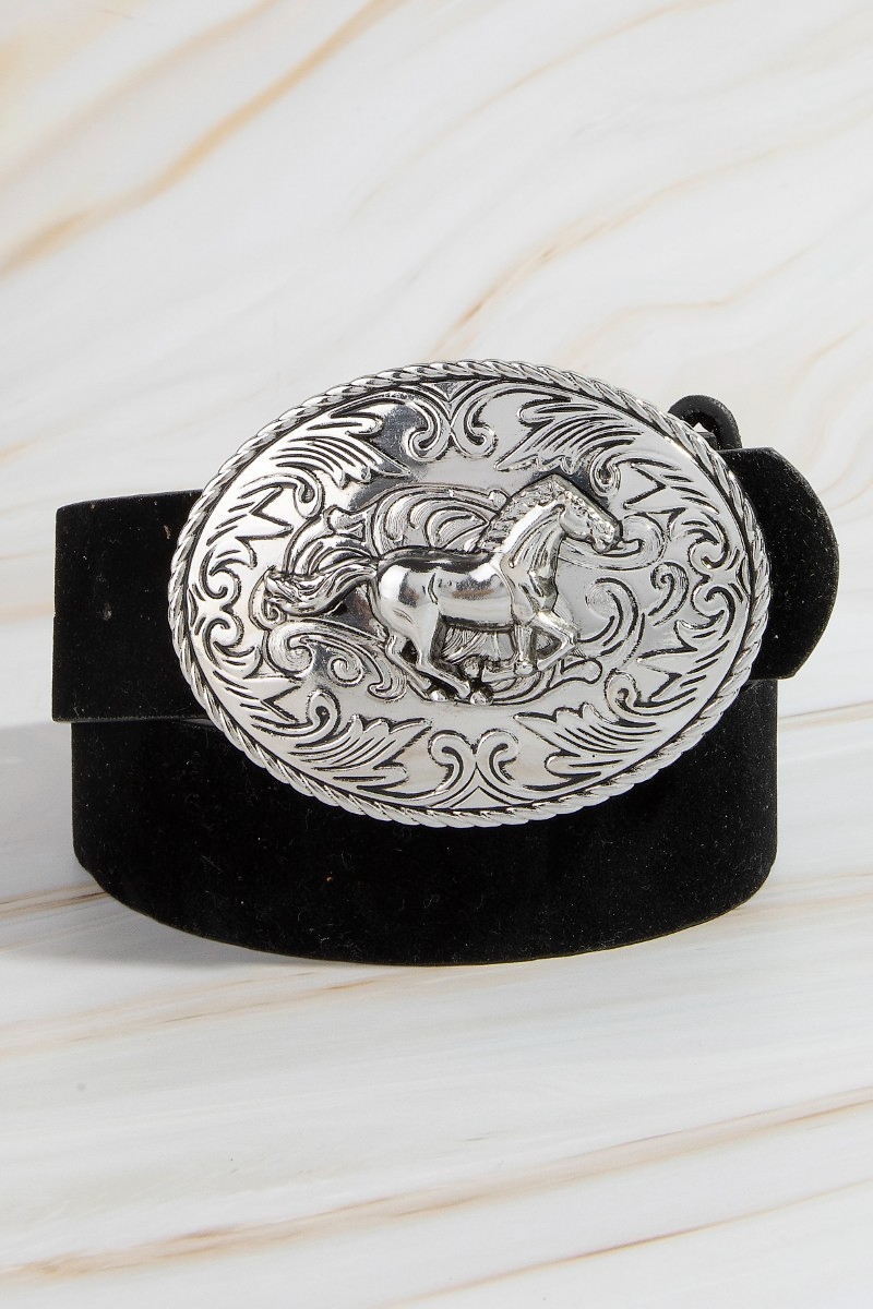 • This belt features a fashionable western large engraved horse buckle style. Embark on a journey of sartorial refinement as this belt effortlessly complements your fashion sense.