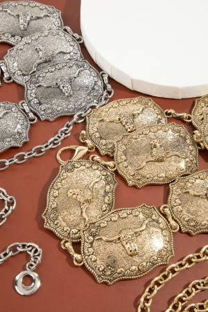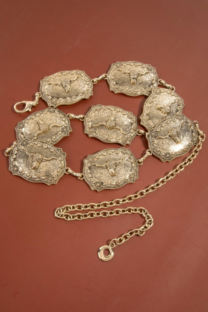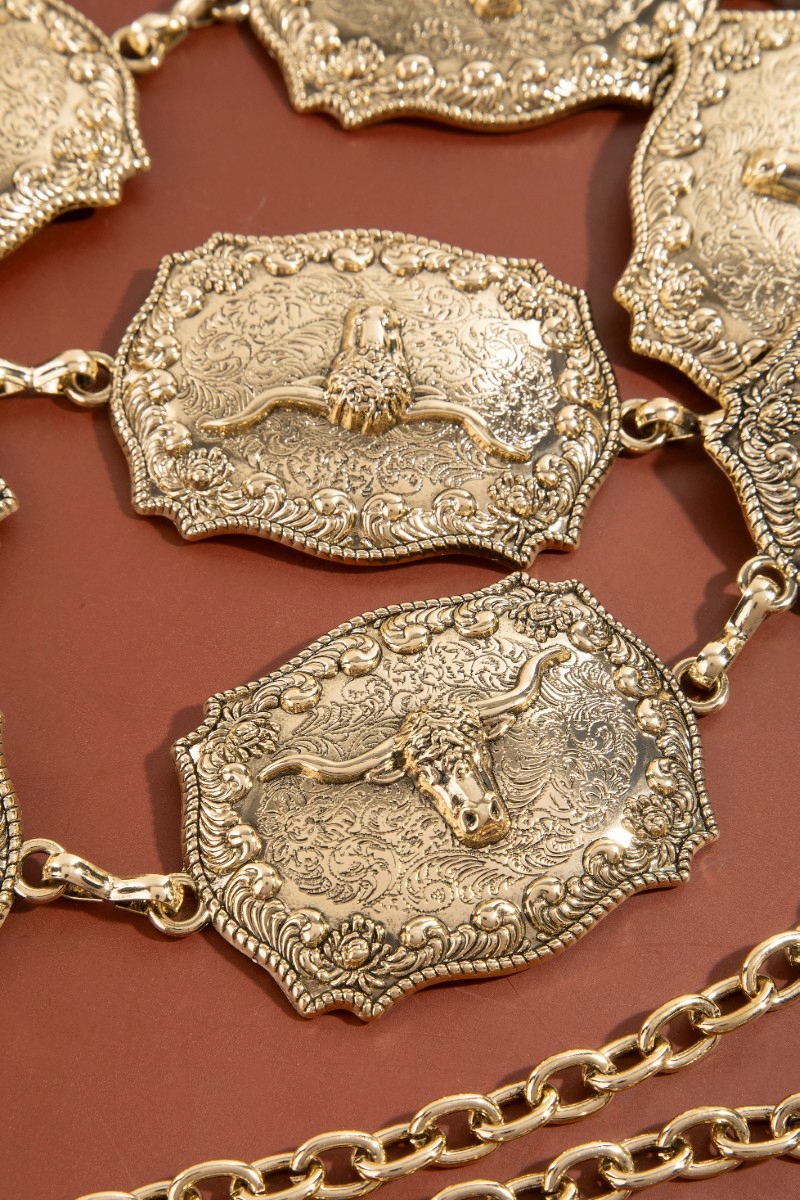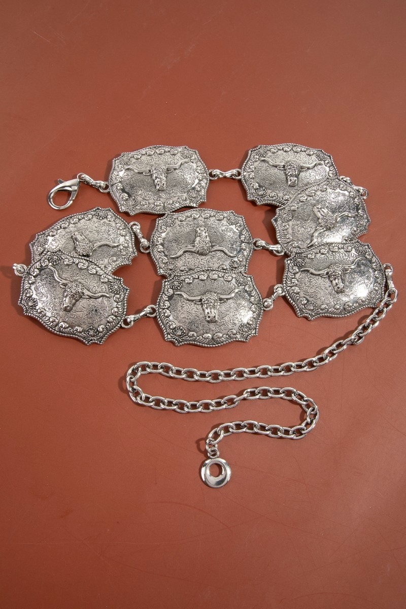 • This chain belt adds a modern western longhorn engraved style. Savor the allure of detailed craftsmanship in this exquisite chain belt.