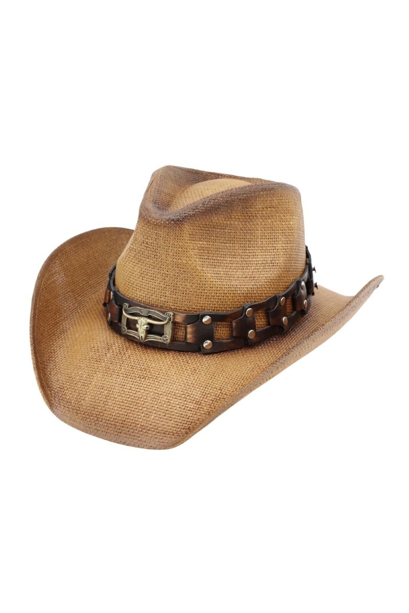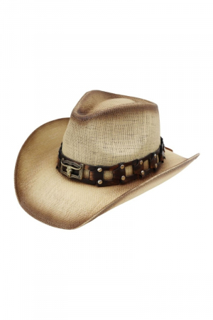 • This cowboy hat introduces a stunning western studded longhorn strap straw style. Experience refined sophistication with this understated yet stylish piece.